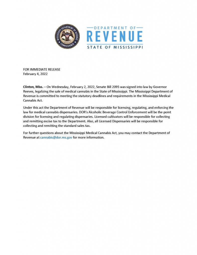 Proposed regulations for taxes applicable to medical cannabis are now available for public comment through May 27, 2022, and can be viewed at www.dor.ms.gov/abc/medical-cannabis under the ‘Dispensary Regulations’ heading.